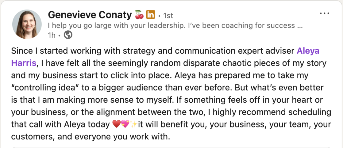 Aleya’s genius lies in spotting the hidden patterns others miss and turning them into strategic, story-driven messages that create impact and income.